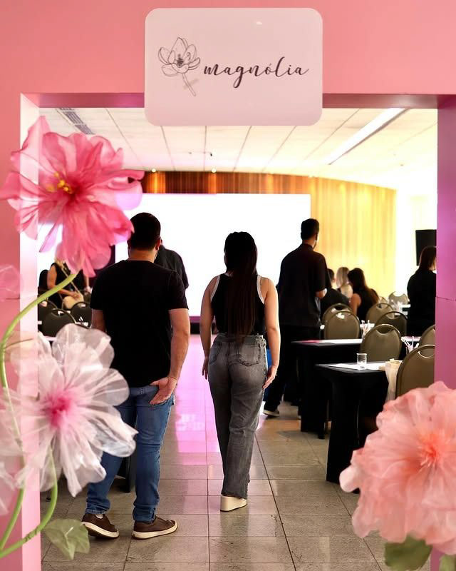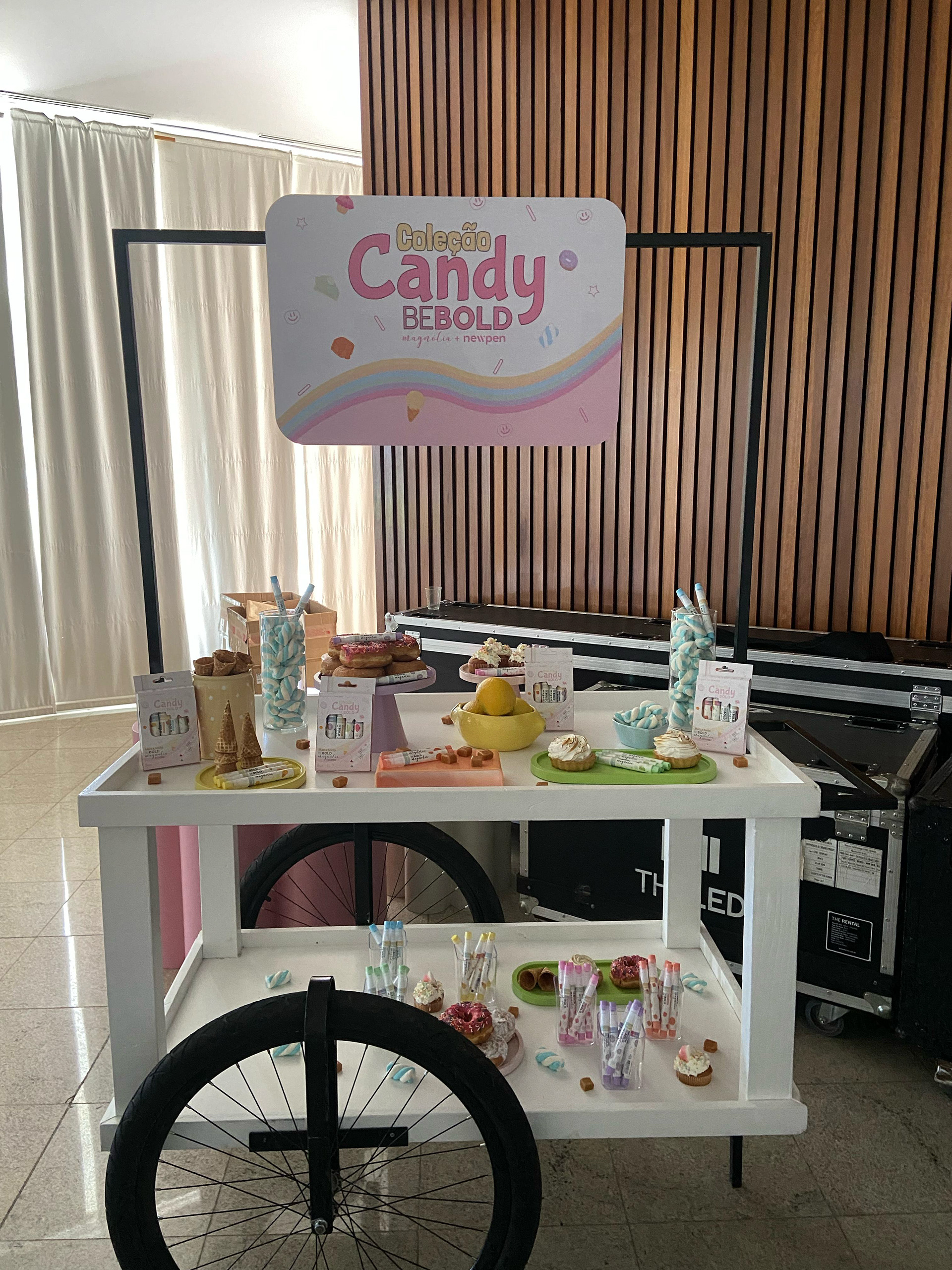 O grande destaque do evento ficou por conta do arco com magnólias gigantes de papel que marcavam a entrada do evento e se tornaram o ponto instagramável do espaço. Já para o lançamento da collab BE BOLD + Coleção Candy Magnólia, desenvolvemos um carrinho de doces mesclando os produtos com algumas guloseimas, em uma brincadeira sensorial que transformou o momento em uma grande festa.