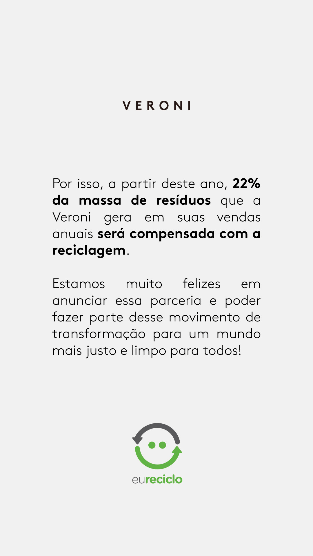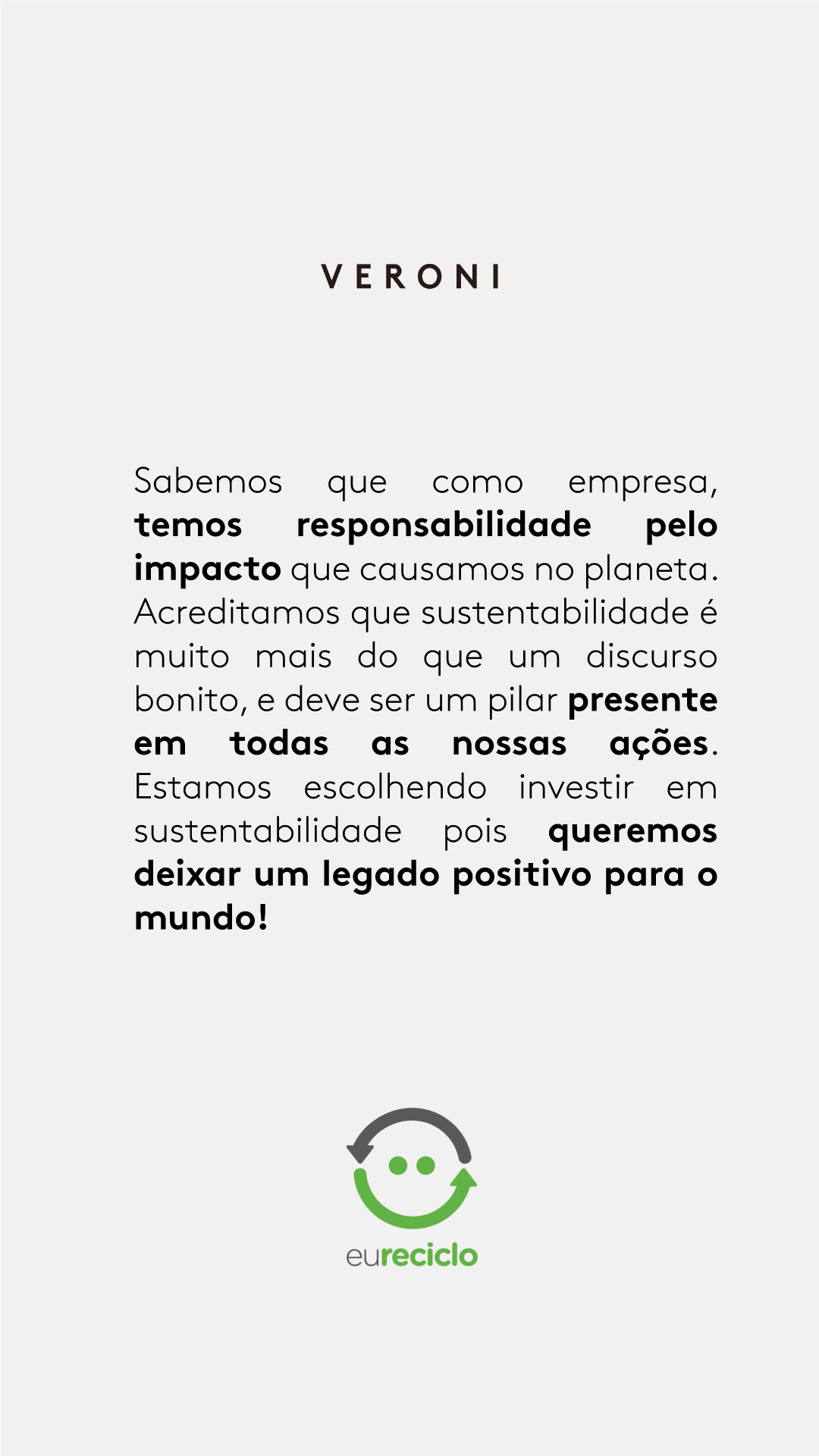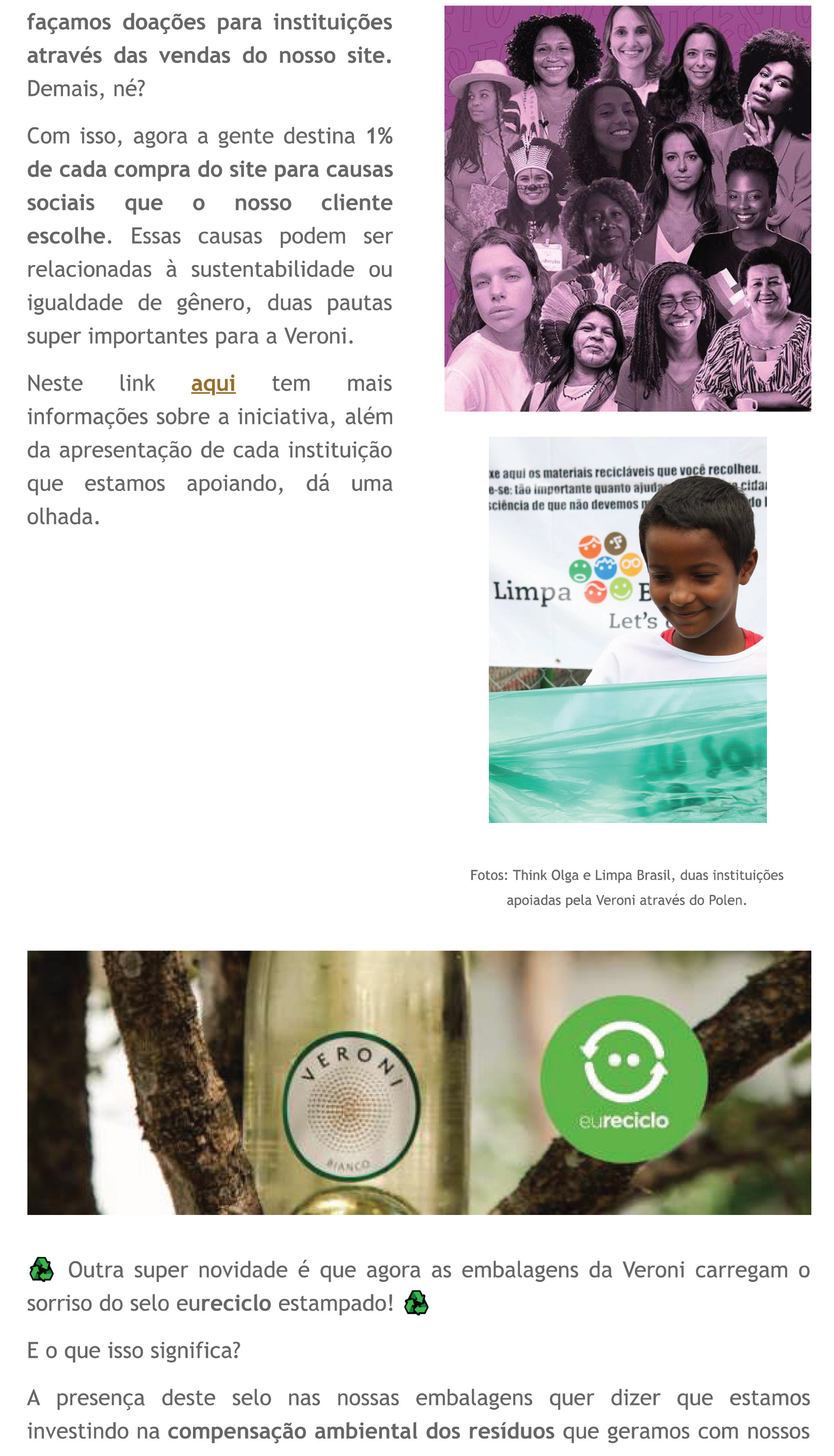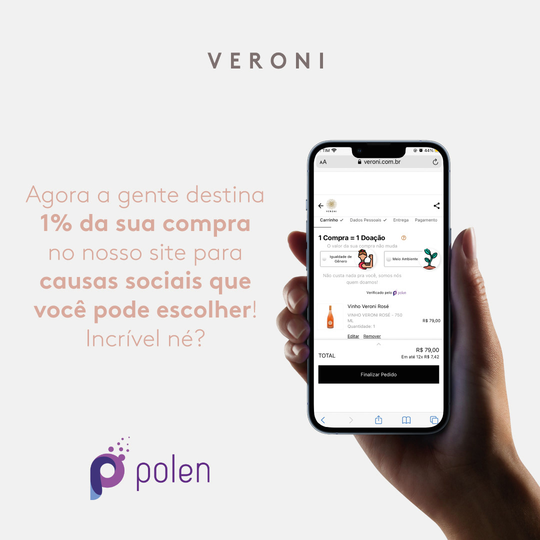 A Veroni carrega a sustentabilidade em seu DNA, pois nasceu já com a certificação fairtrade e com todos os vinhos veganos em sua composição. Entre 2021 e 2022 tivemos a oportunidade de estar a frente do planejamento e implementação de parcerias que reforçaram este posicionamento, conquistando o Selo eureciclo e a parceria com a fintech de impacto Polen.